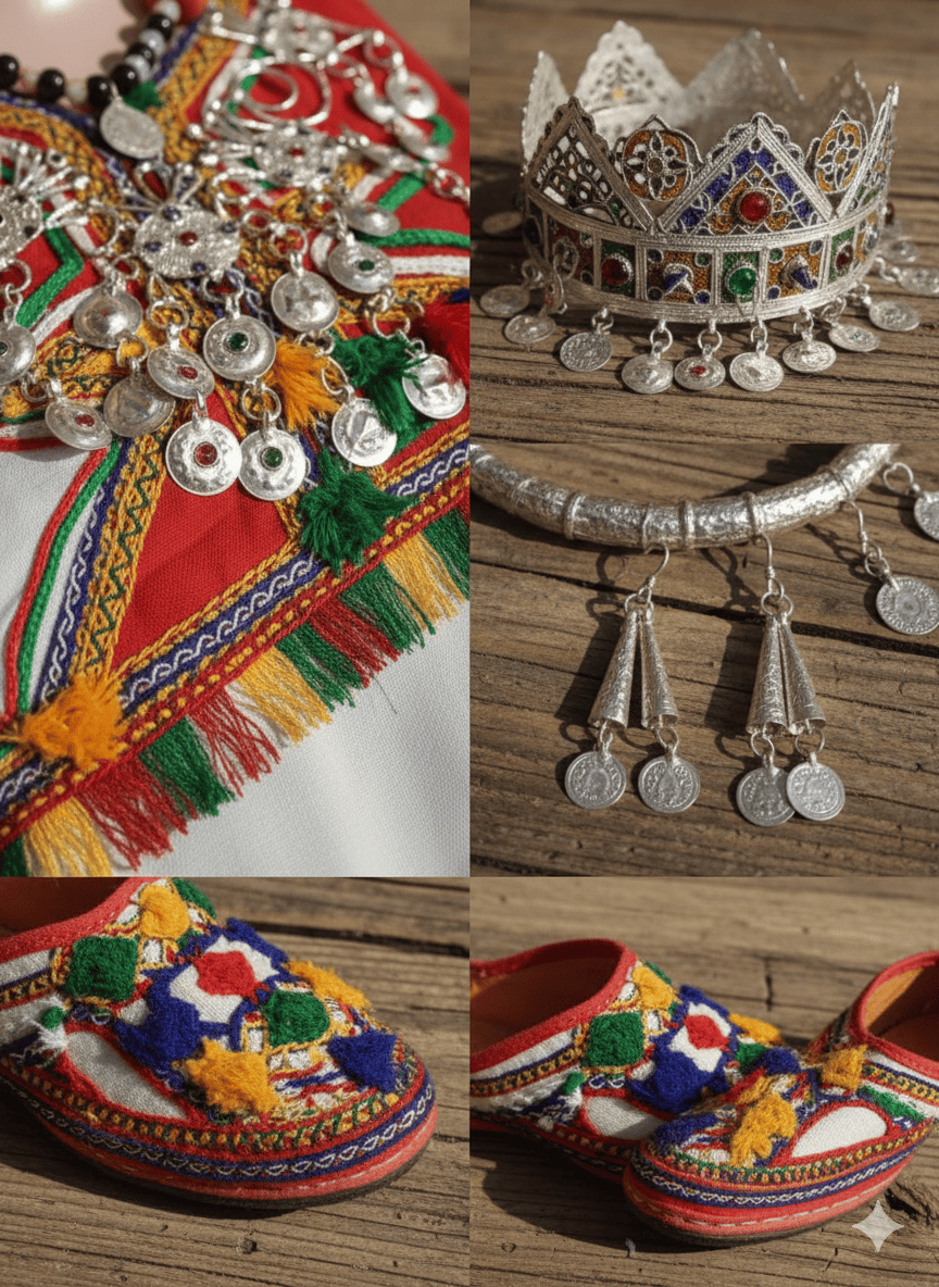 الحلي الفضية التَّقليدية (كـ "تِسْكُوِينْ" أو التاج والأقراط الطويلة) ليست مجرد زينة، بل هي درع يزيد من هيبتكِ ويُكمل صورتكِ كملكة أمازيغية عصرية تعرف قيمة تراثها.