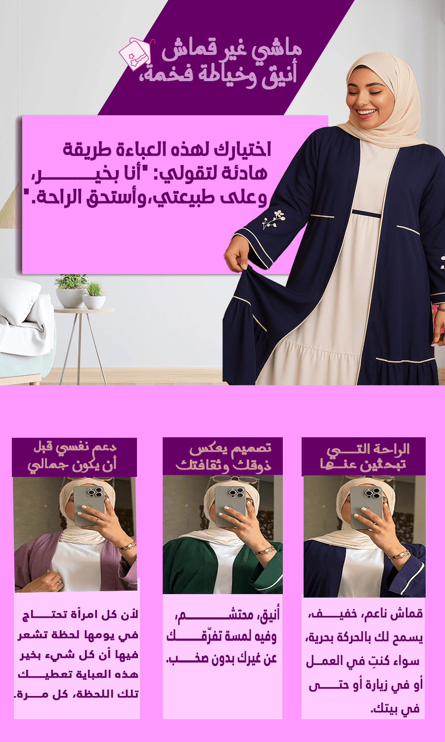 نعرف كم يكون اليوم طويلاً بالتحديات. عبايتنا تمنحك أناقة محترمة وراحة تساعدك على التركيز والثبات، مع تصميم يُظهرك بأفضل صورة بدون أن تشعري بأي ضغط أو ضيق.